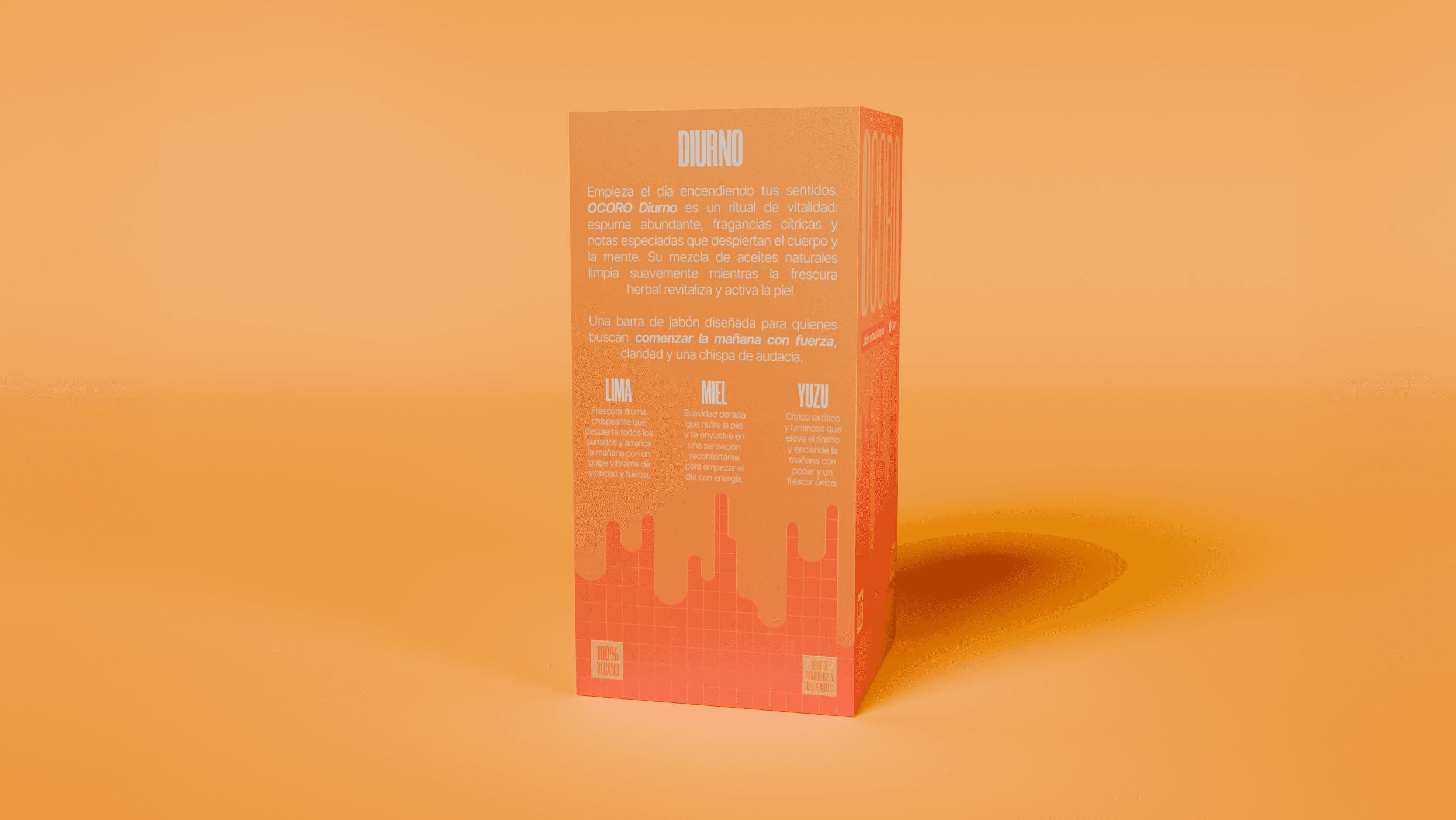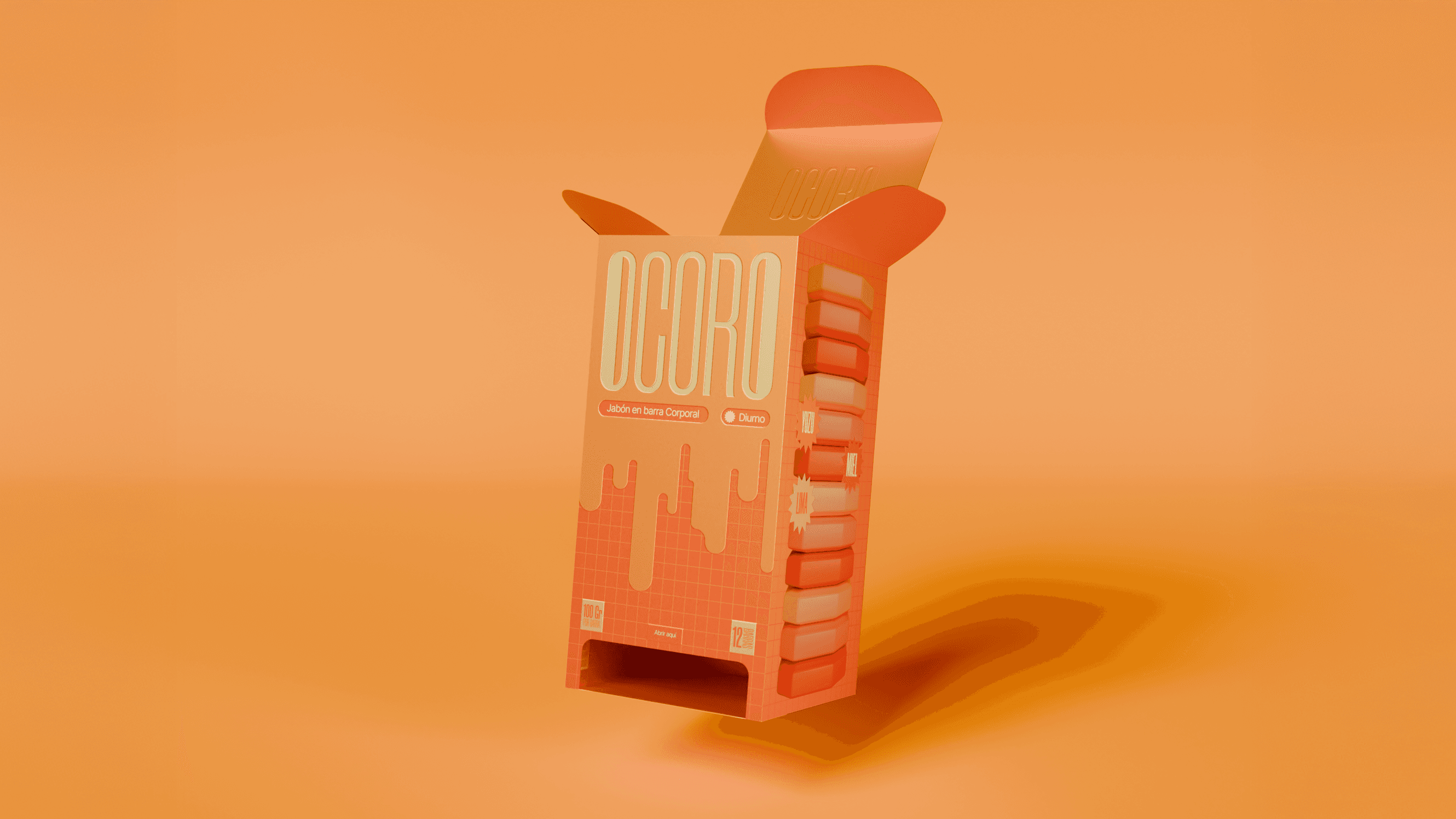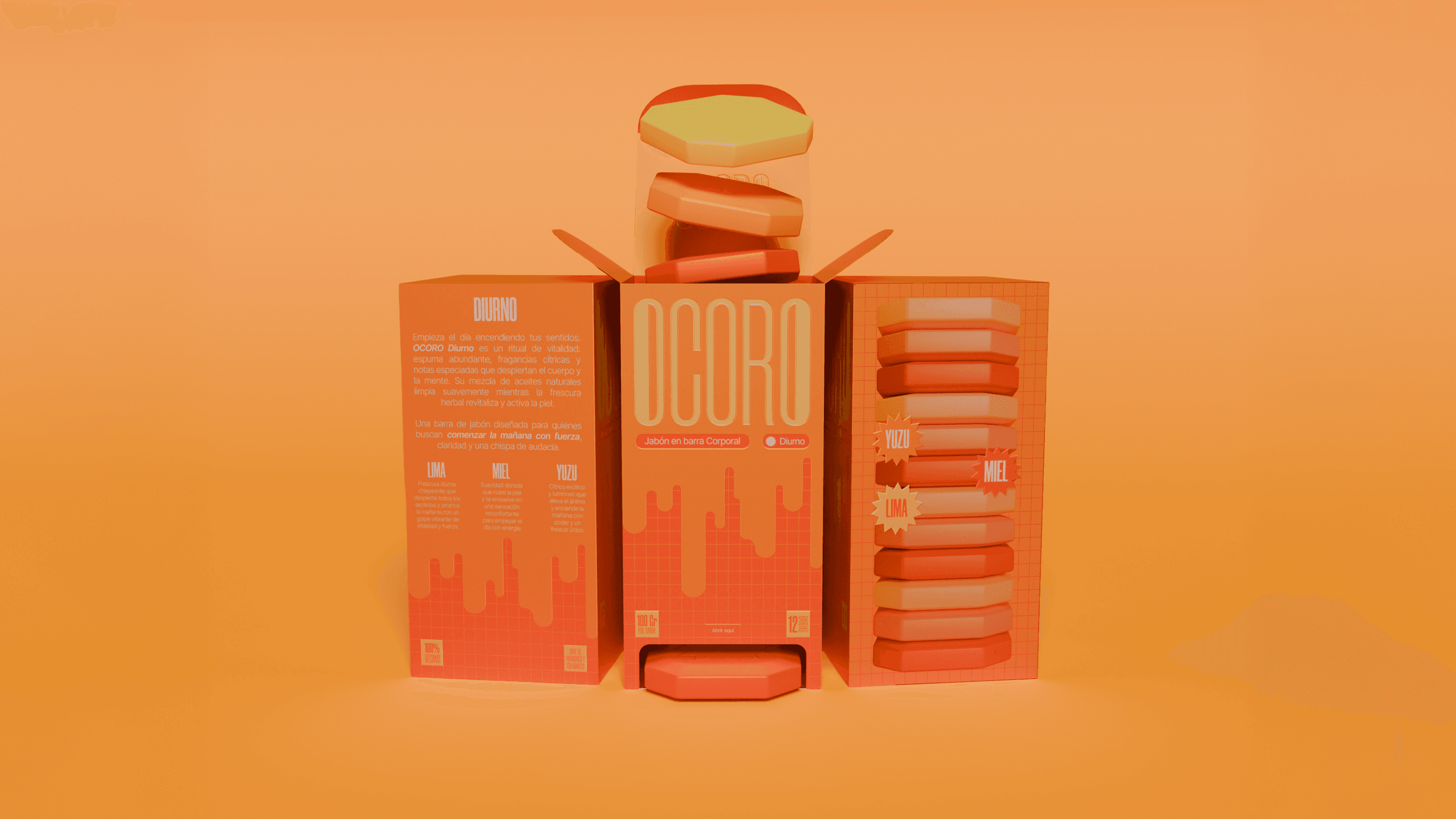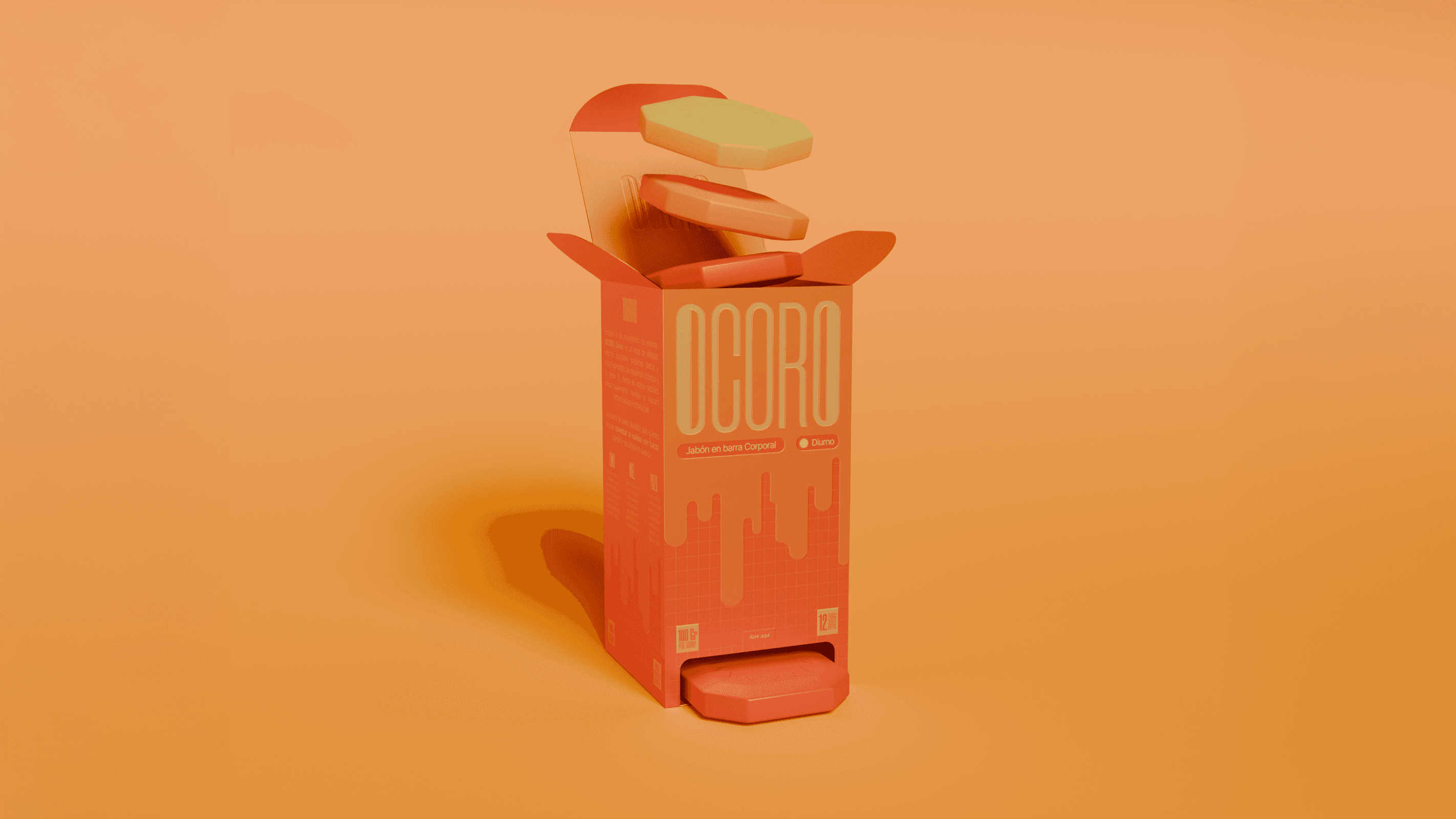 En OCORO, la estrategia de diseño parte de un principio claro: romper con la estética tradicional del jabón artesanal, usualmente asociada a lo neutro y lo natural. Apostamos por un lenguaje visual vibrante y estructurado, donde el color y la composición activan la percepción. Cada decisión —desde la dualidad día/noche hasta la modulación gráfica— refuerza una identidad que busca despertar los sentidos y resignificar lo cotidiano a través del diseño.